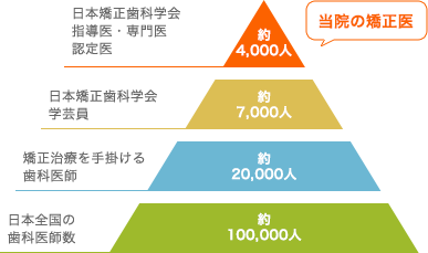 当院の矯正医は日本全国で10万人いる歯科医師の中でもわずか4,000人しかいない日本矯正歯科学会の認定医です。